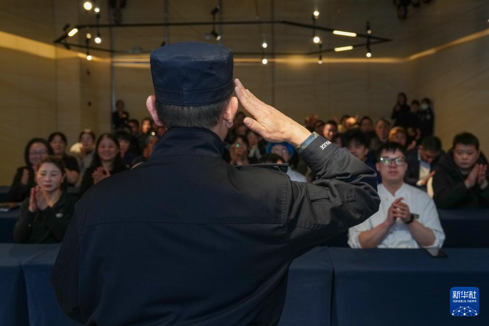 1月8日,民警赵阳在辖区内一家酒店进行安全宣传活动结束后敬礼。