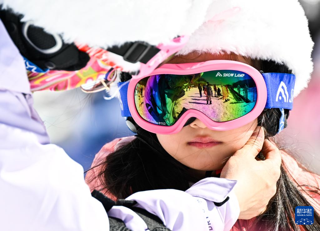 1月11日,家长在江苏省句容市宝华山滑雪场给小朋友整理装备。