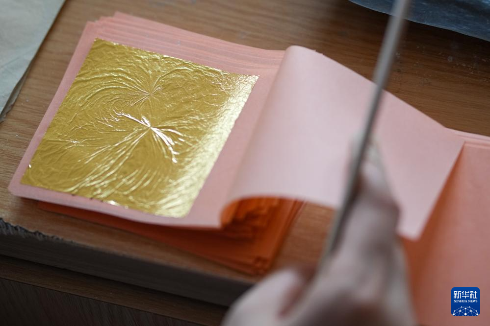 在南京金陵金箔集团股份有限公司,工人将金箔切片(2月10日摄)。
