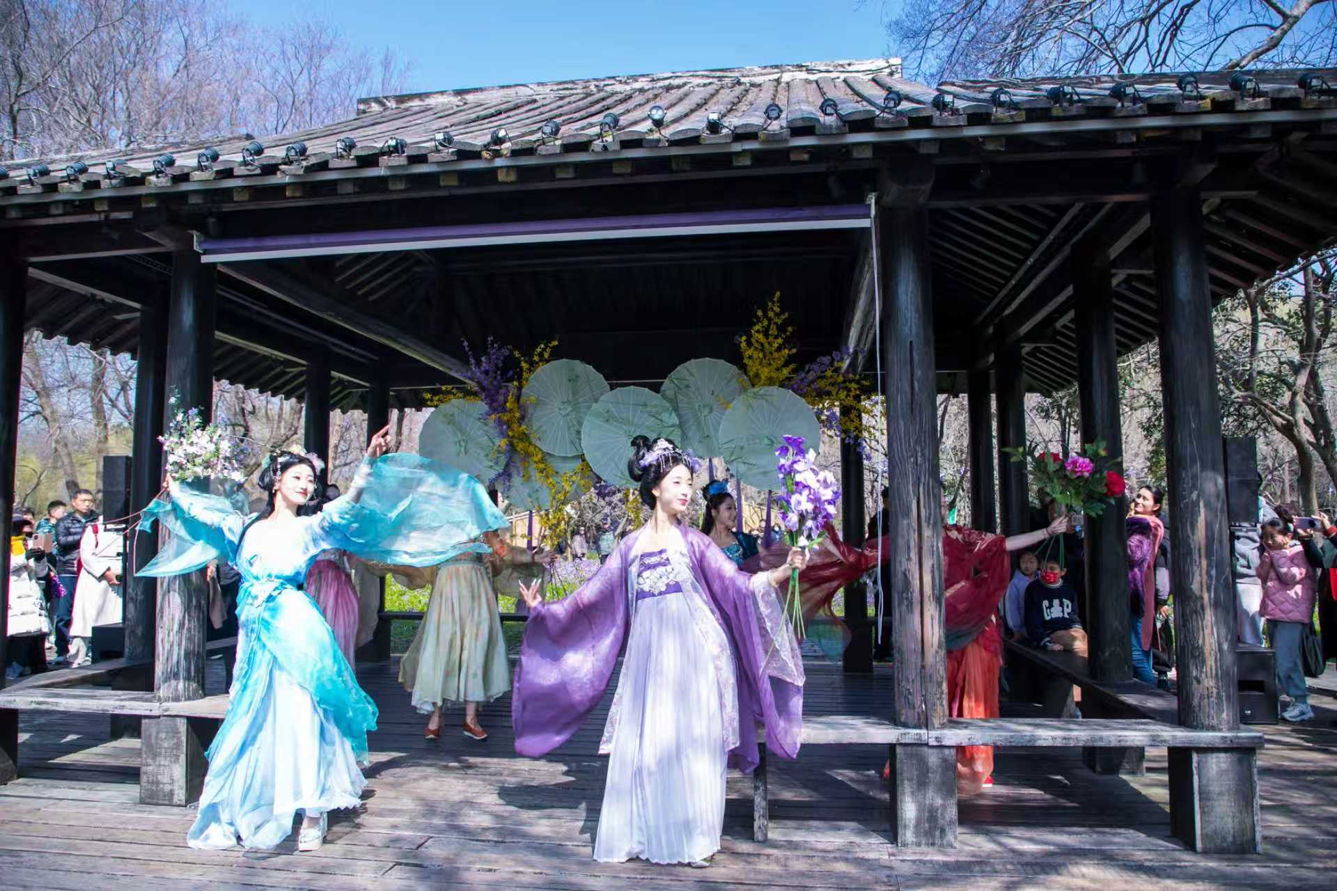 “我们希望通过精细化打造,增加市民游客的游园赏花体验感。”宋夹城风景区管理处相关负责人介绍,园内的树林间特意悬挂“捕梦网”、增加泡泡机装置,闲云亭则布置了古风伞面,还在部分步道旁的树木上装点竹筒风铃花,这些一步一景的巧思设计,让市民游客的每一次驻足都能收获惊喜。