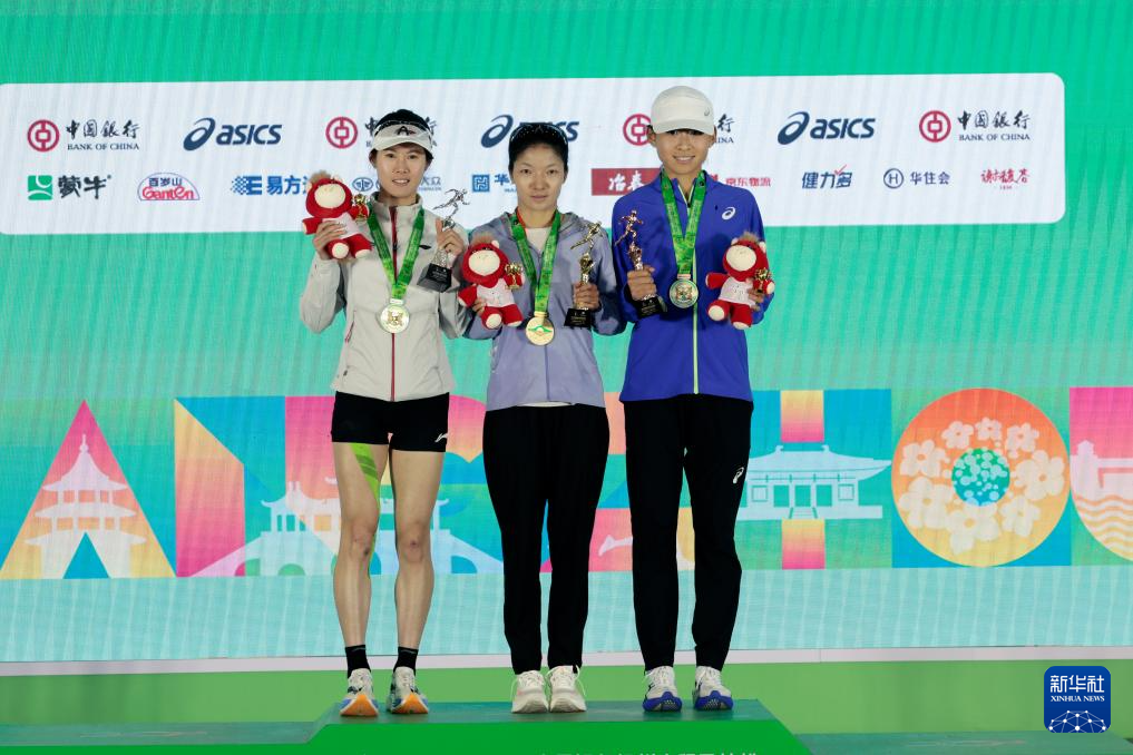 3月29日,女子国内组亚军郑小倩、冠军次仁措姆、季军李媛(从左至右)在颁奖仪式上合影。